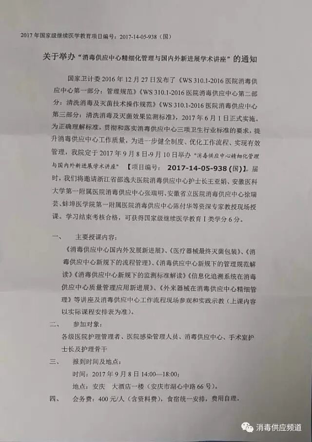 为进一步健全消毒供应中心制度、优化消毒供应中心工作流程、实现有效管理,安庆市立医院将举办 “信息化追溯系统在消毒供应中心质量管理应用新进展”培训班。会议将依据2016年12月27日国家卫计委发布的《消毒供应中心三项卫生行业标准》中的关于信息追溯要求,沟通探讨信息化追溯系统在消毒供应中心质量管理中的应用过程。针对消毒供应中心在运行过程中出现的重点难点问题进行解析,针对管理中的困惑组织研讨与交流,以期推动消毒供应中心专业发展;届时,将邀请资深专家进行现场授课。